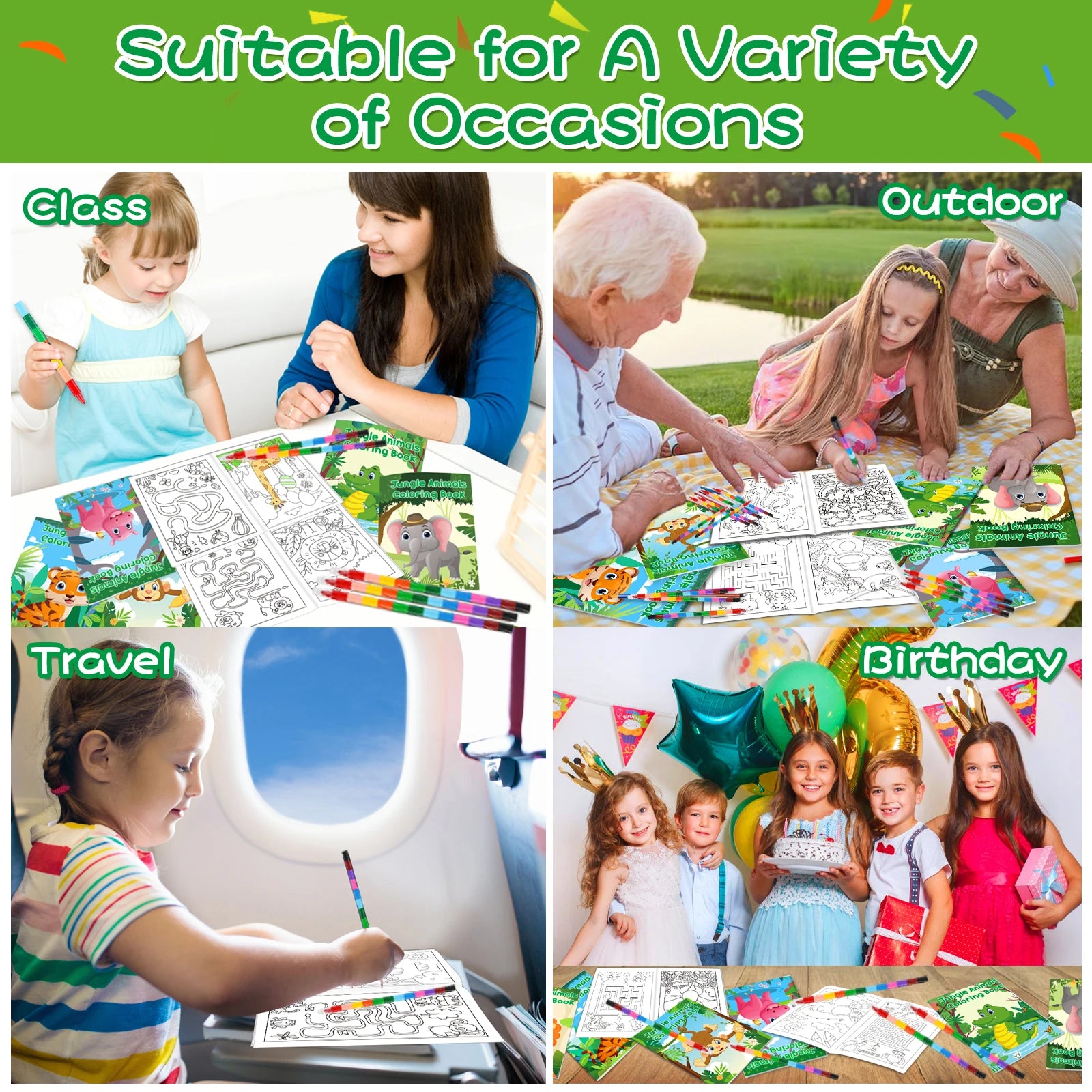 24Pcs Jungle Safari Animals Coloring Books for Kids with 24 Stacking Crayons Mini Coloring Book Party Favors Bulk Gifts Small A