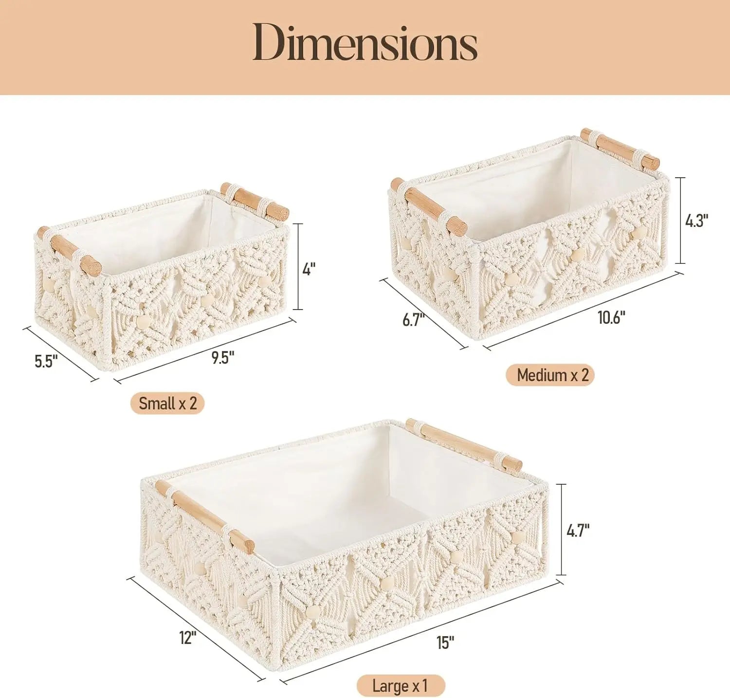 Boho Storage Baskets For Organizing 5 Pcs Macrame Decorative Hand Woven Storage Bins With Natural Wooden Handles Beads Box