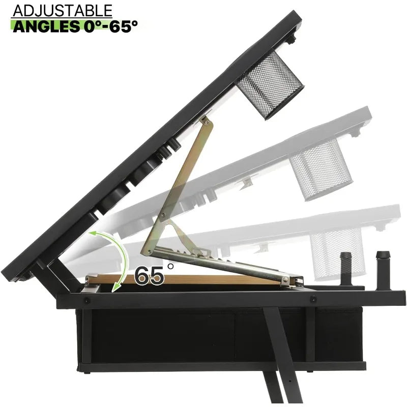 Drafting Table Set Adjustable Height Artist Desk with Tilting Wooden Tabletop and Sliding Desktop, Multifunctional Art Desk