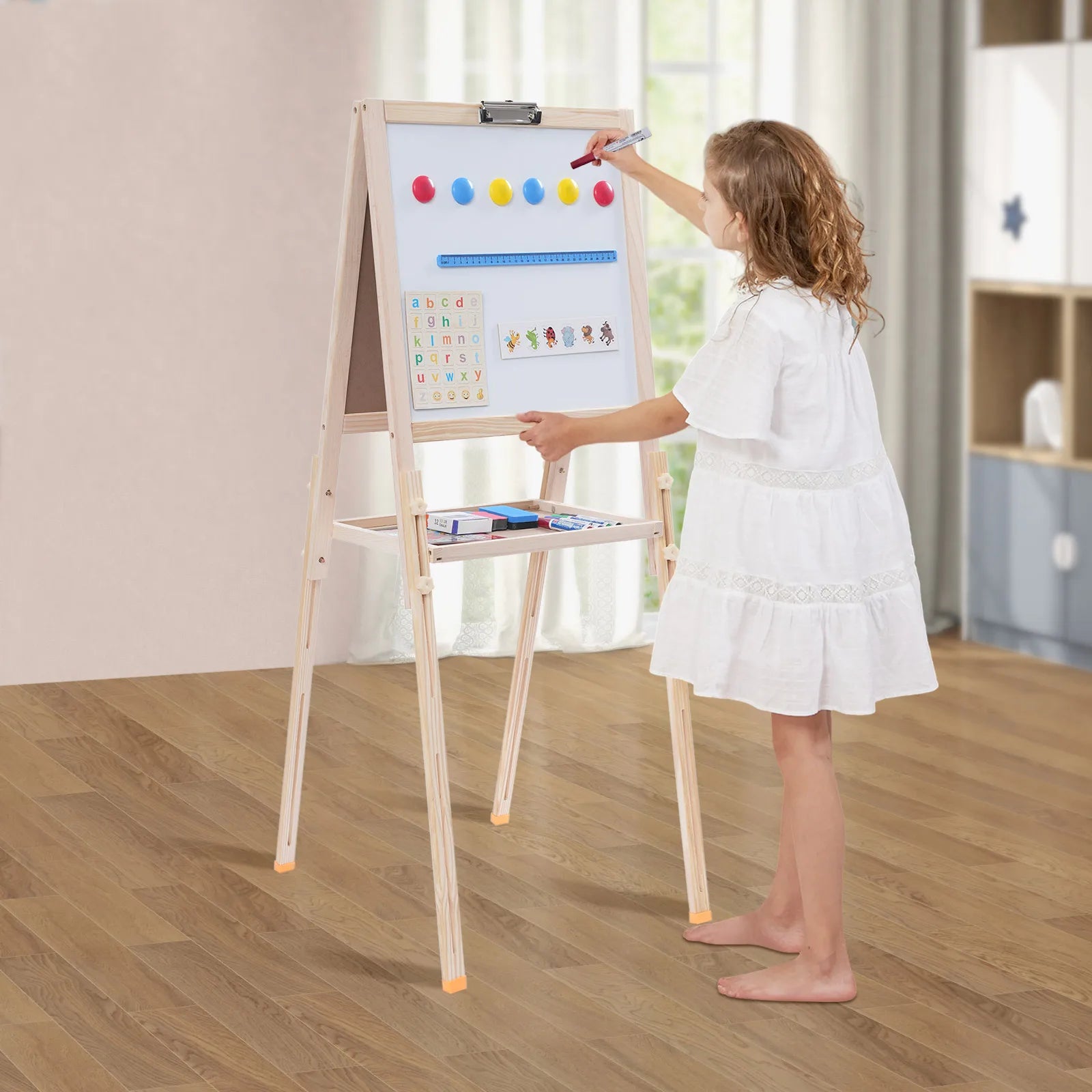 Kids Art Easel Stand Adjustable Wood All-in-One Toddler Easel with Chalkboard/Whiteboard for Kids Aged 2-8 Free Standing Easel